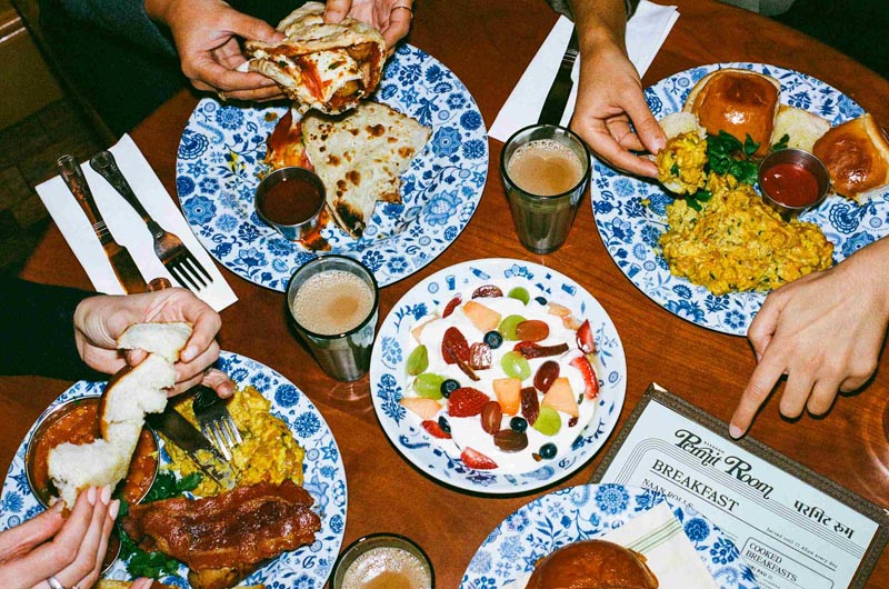 For mornings (or the morning after), there are Breakfast Naan Rolls, The Full Permit with nicely spiced Akuri and smoky bacon, and the indulgent sweet-and-savoury Permit Room French Toast. Bottomless House Chai flows freely to ease guests into the day.