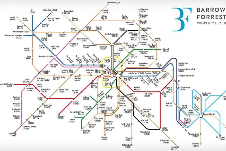 Based on the mayor’s 2040 vision of what the West Midlands tube map could look like, Barrows and Forrester looked at current property prices along the existing and ‘future’ transport links to highlight where you can get on the ladder now and for what price.
