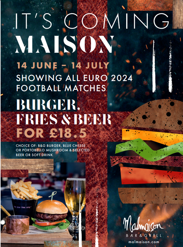 Join Malmaison Manchester Piccadilly to support England in the UEFA Euro 2024! From the 14th to the 24th of July, you can indulge in their exclusive offer of a delicious Mal Burger & a Beer of your choice for just £18.50 per person.